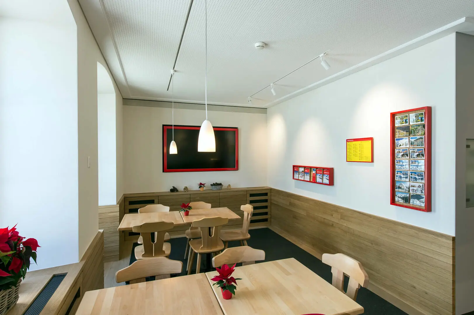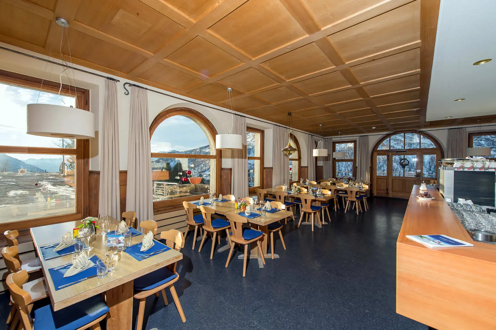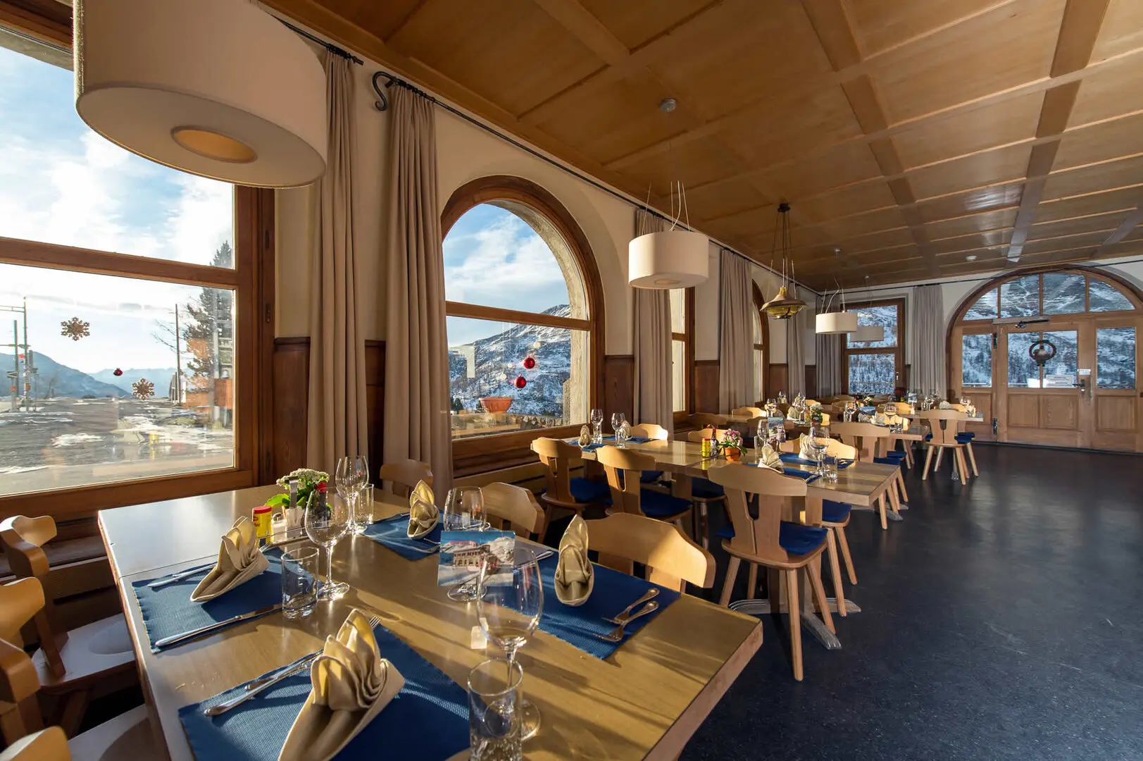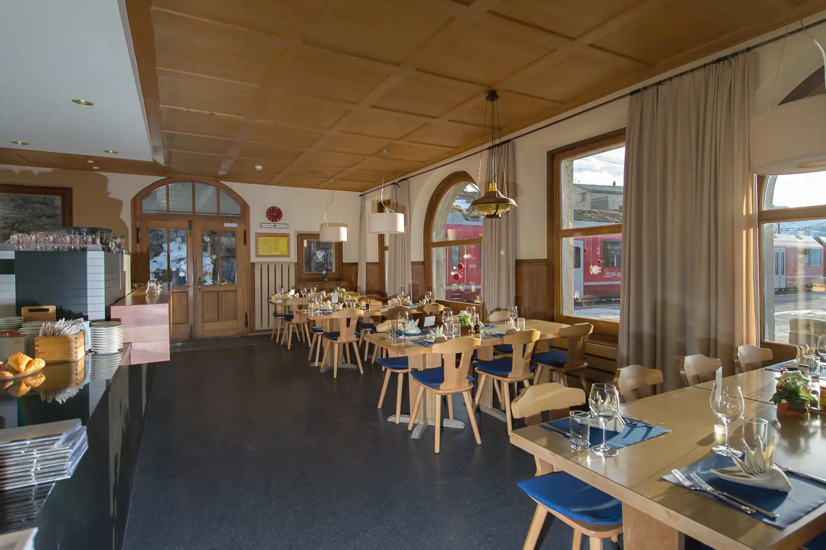 L'edificio dell'Alp Grüm, caratteristico e robusto, è stato costruito per resistere alle severe condizioni climatiche delle Alpi. Internamente, il ristorante irradia un'atmosfera calda e accogliente, arricchita dall'arredamento e dallo stile tradizionale svizzero, con ampio uso di legno che aggiunge un tocco rustico.